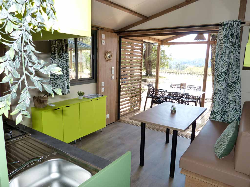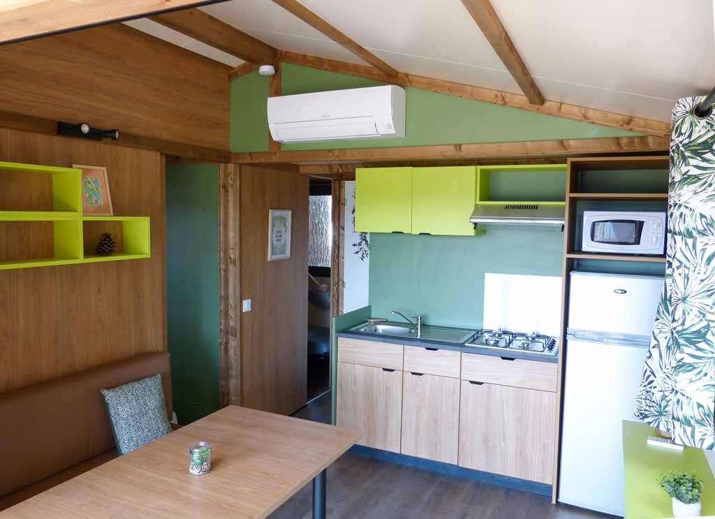 - Cuisine équipée : 4 feux au gaz, frigo, congélateur, micro-ondes, cafetière Senseo, bouilloire, couverts et vaisselle.