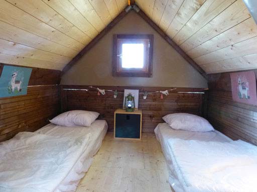 - 2 chambres à l’étage : une avec un lit double en 140, l’autre avec 2 lits simples, couettes et oreillers fournis