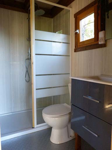 - Espace repas: réfrigérateur, plaque de cuisson, micro-onde, cafetière filtre, bouilloire, couverts et vaisselle